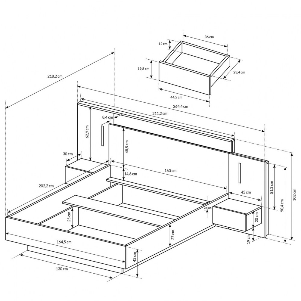Cama para colchão de 200x160cm, colchão e estrado não incluido.