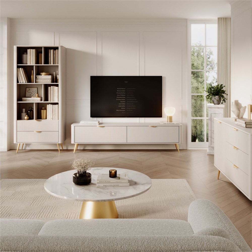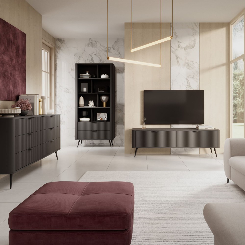 O conjunto LANTE na cor preta é uma combinação de elegância e classe com modernidade e originalidade. A coleção deve seu caráter incomum às interessantes frentes de MDF ranhuradas, bem como às bordas arredondadas, aos sutis puxadores pretos e às pernas finas e enroladas, acrescentando leveza visual ao arranjo. A estante possui painel HDF preto com estrutura de madeira no verso e gavetas. Tudo isso vai agregar elegância à sua sala e trazer um toque de modernidade.