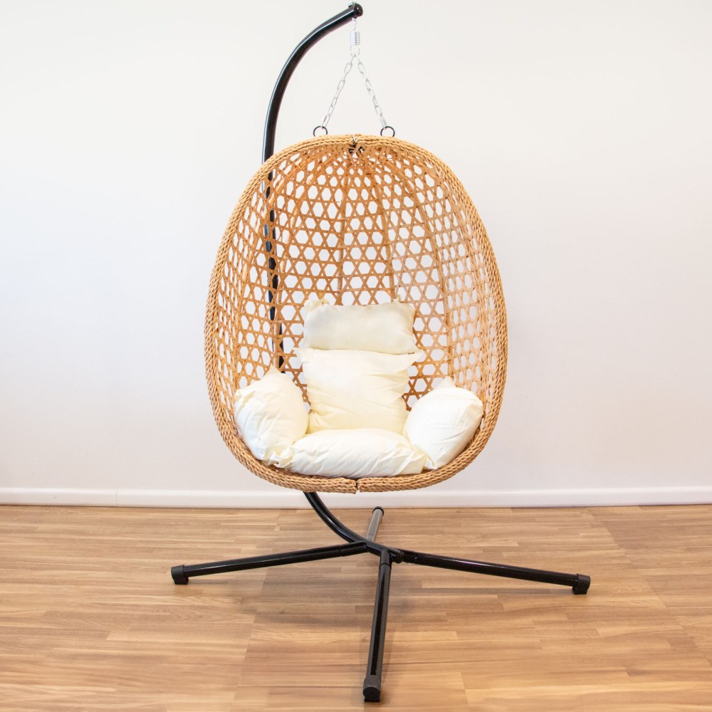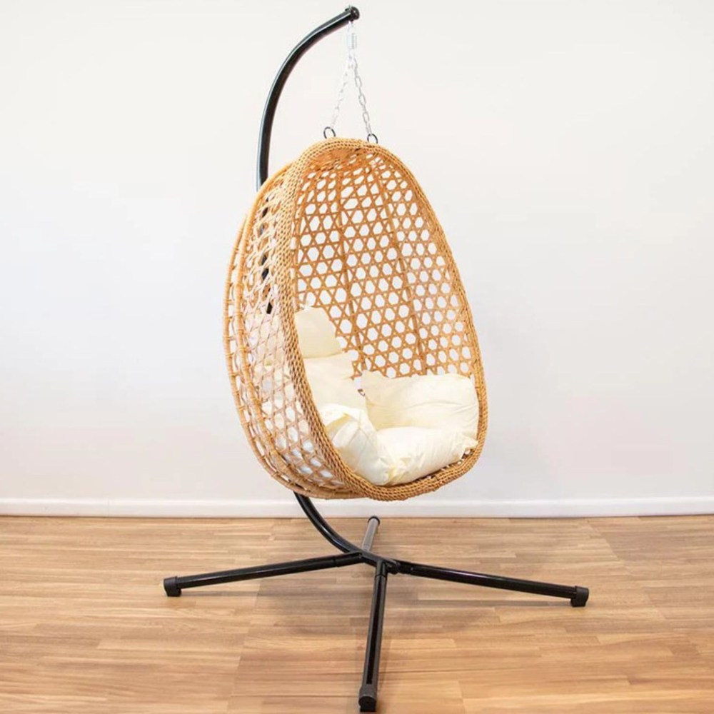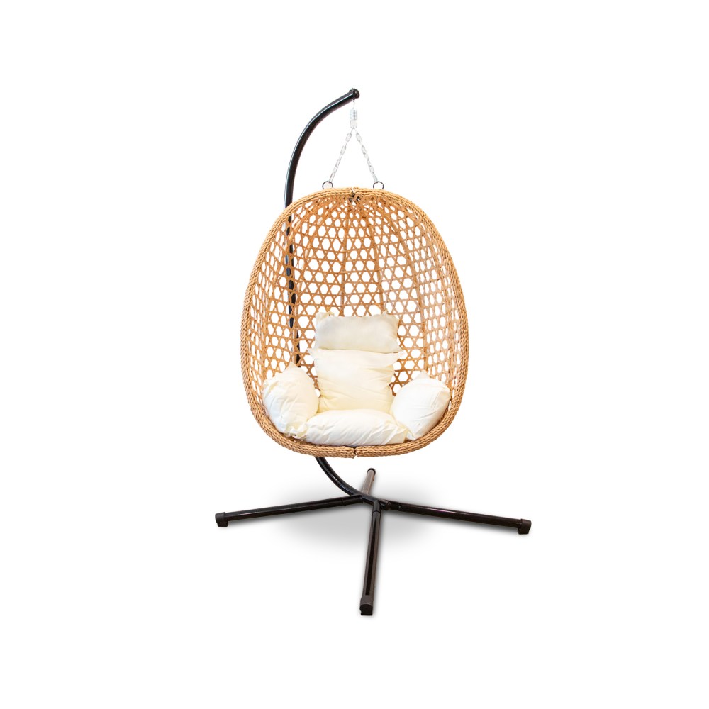 Especificações: Cadeira de baloiço castanha com estrutura em ferro e revestida com polietileno, almofadas acolchoadas com enchimento de poliéster. Suporta um peso máximo de até 150kg. Estrutura: 95x95x195cm