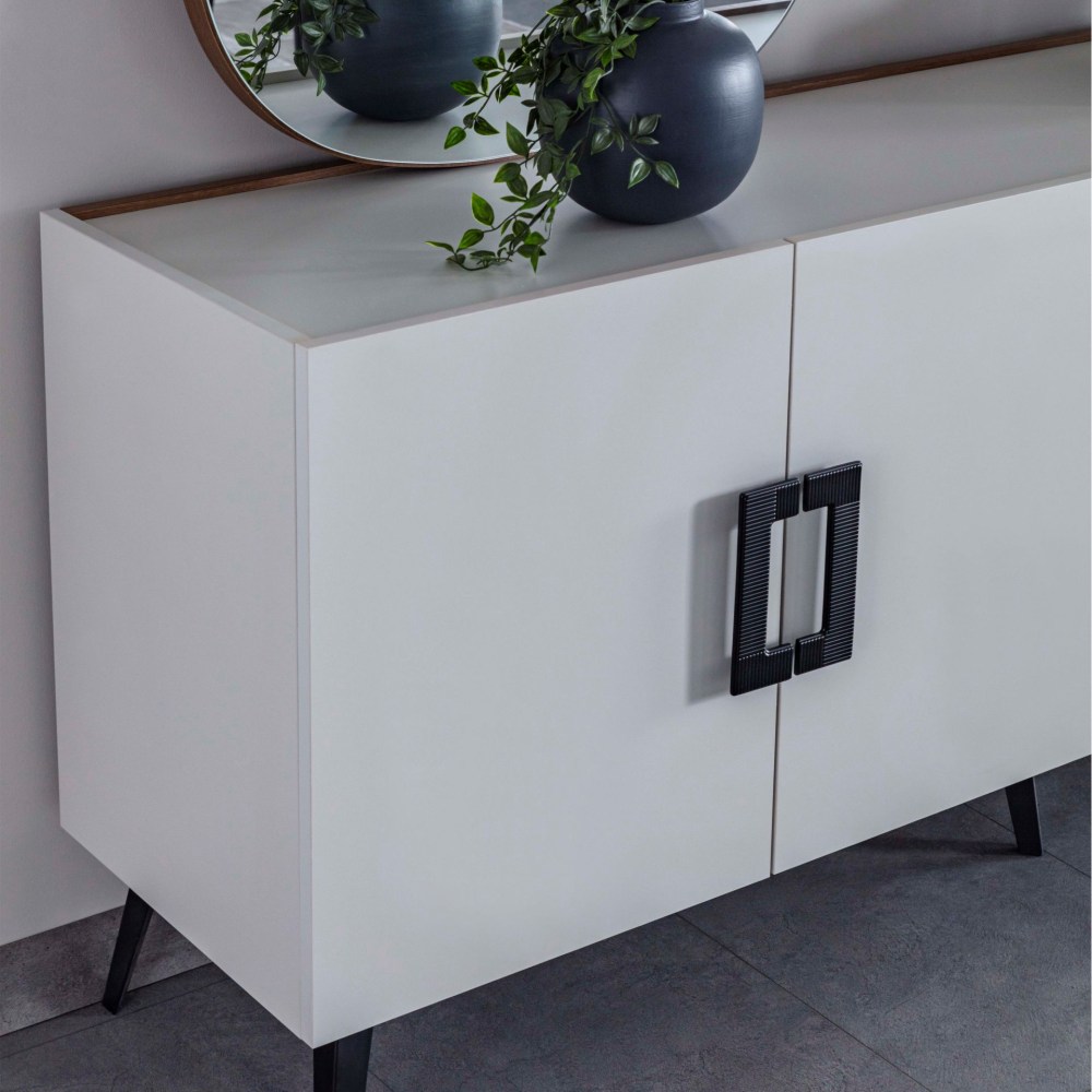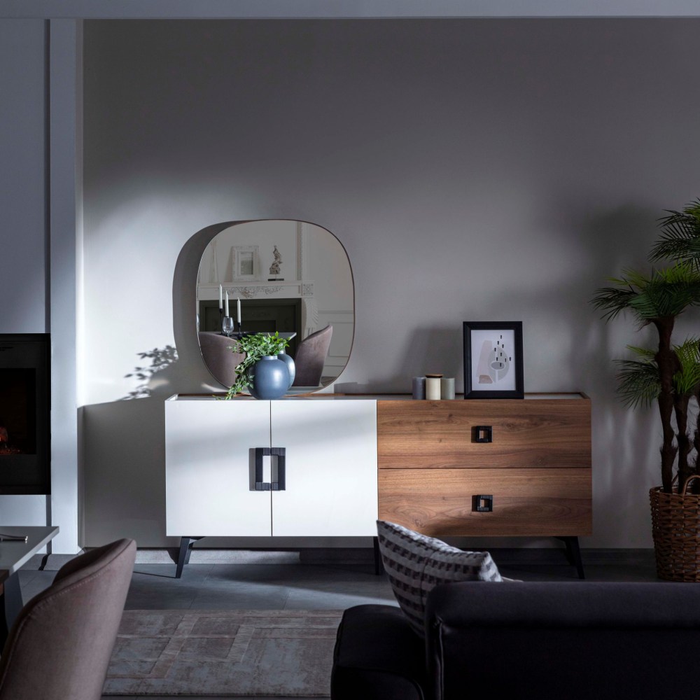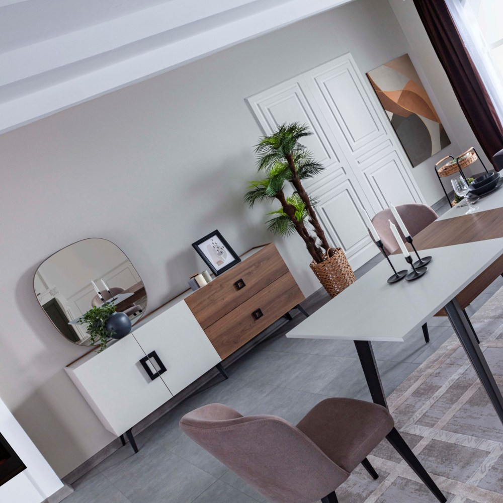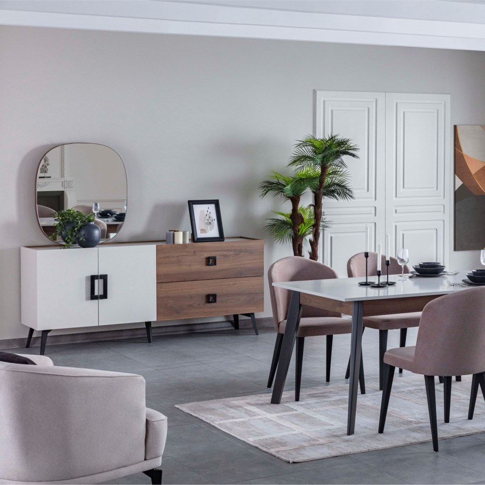 Mayra completa a elegância da sua casa com a sua linha de design elegante e harmonia única de madeira e nogueira. Oferece espaços úteis para seus pertences com suas amplas gavetas e grandes compartimentos de armário.