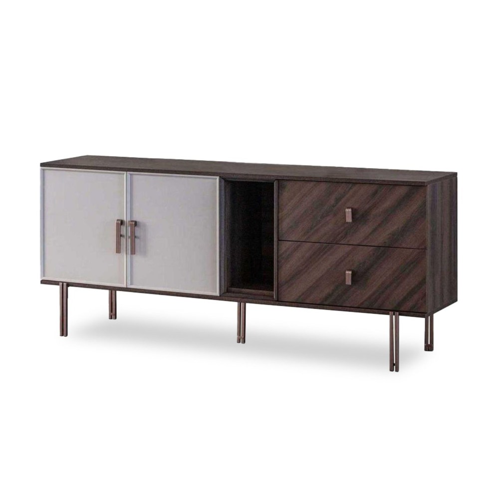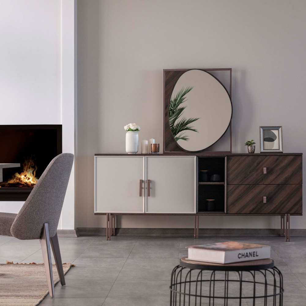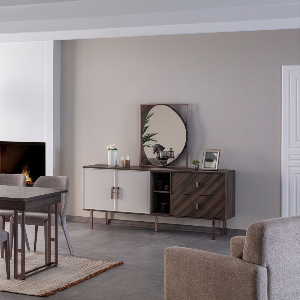 Merlin completa a elegância da sua casa com sua linha de design elegante e harmonia única de detalhes em metal bronze e cor nogueira. Oferece espaços úteis para seus pertences com suas amplas gavetas e grandes compartimentos de armário.