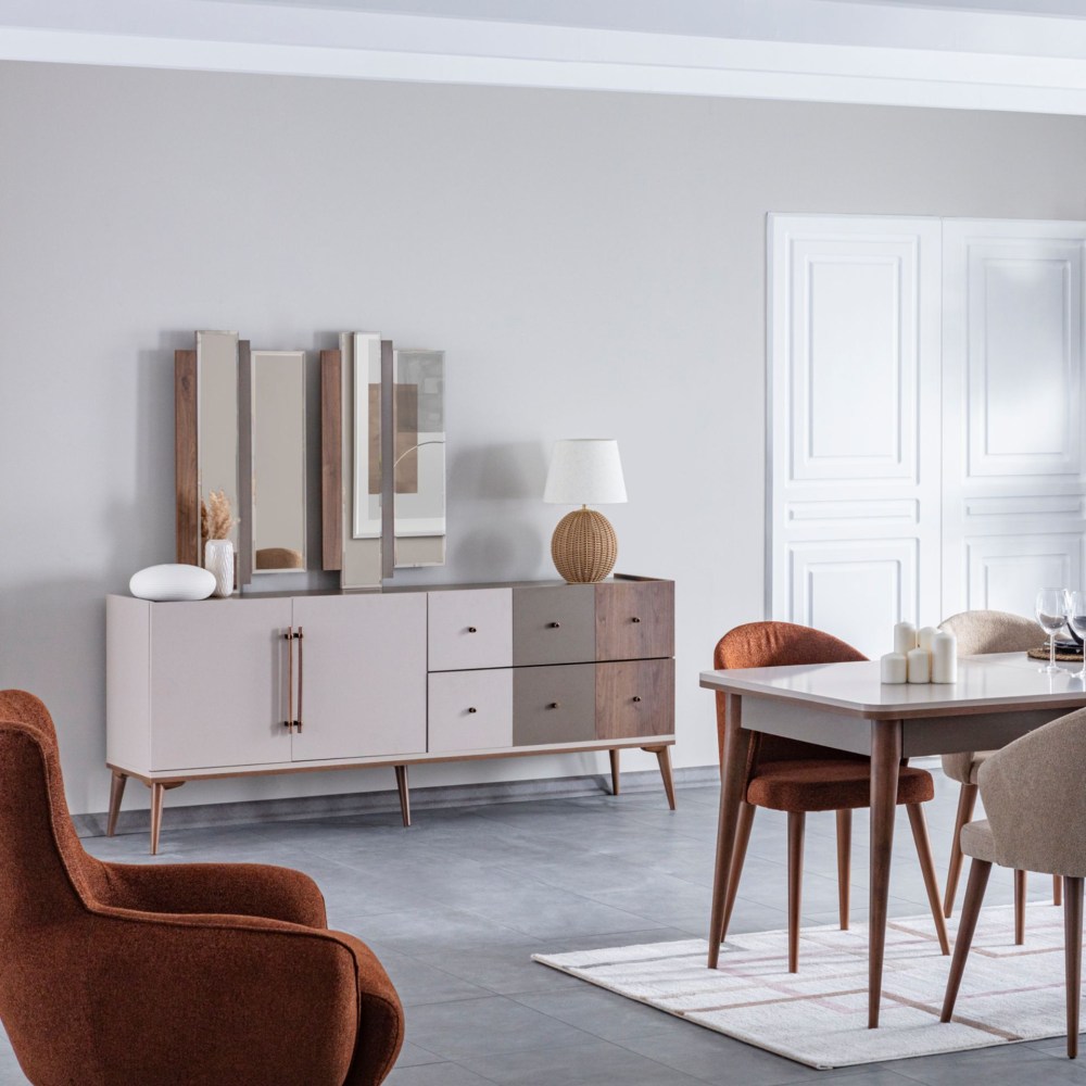 Projetado pensando nas necessidades de armazenamento, Pastel carrega uma linha estilosa e funcional com suas gavetas largas e formato em tons terrosos.