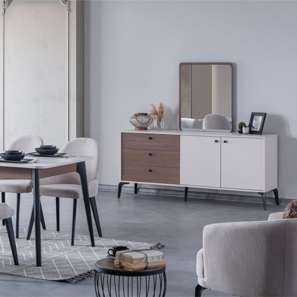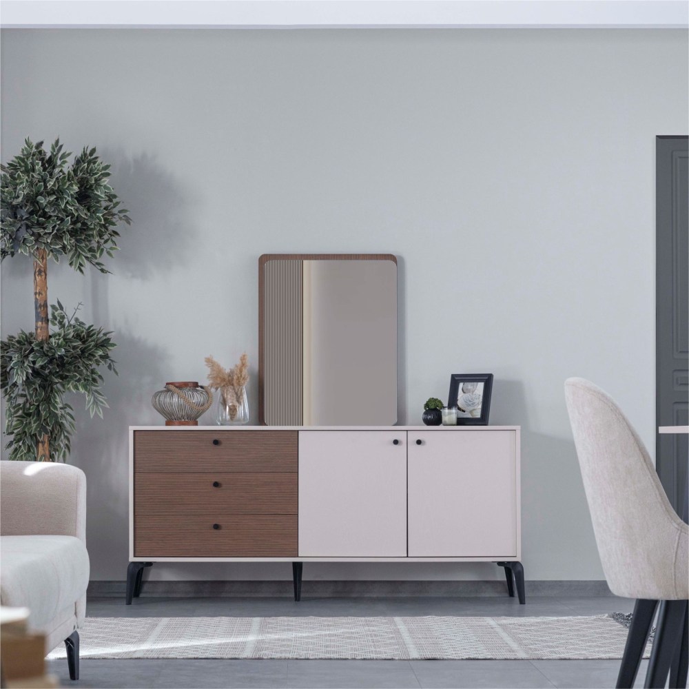 Piedra Console oferece espaços funcionais com sua estrutura composta por grandes gavetas e armários. Combinando os detalhes texturizados das nervuras na sua superfície de madeira com tons quentes de creme, Piedra acrescenta profundidade ao seu design ao mesmo tempo que adiciona uma atmosfera amigável à sua casa.