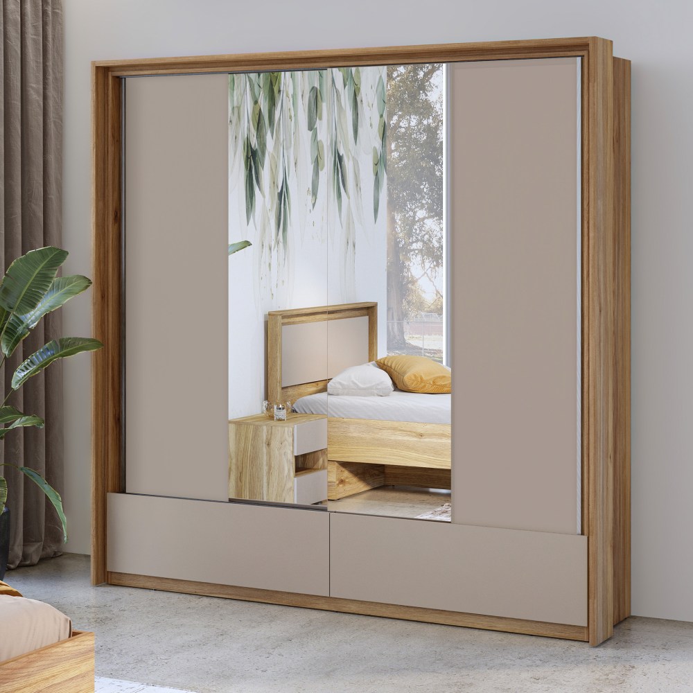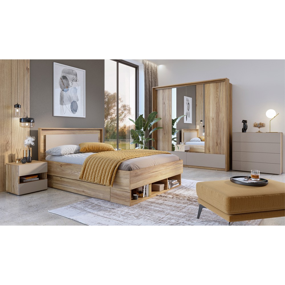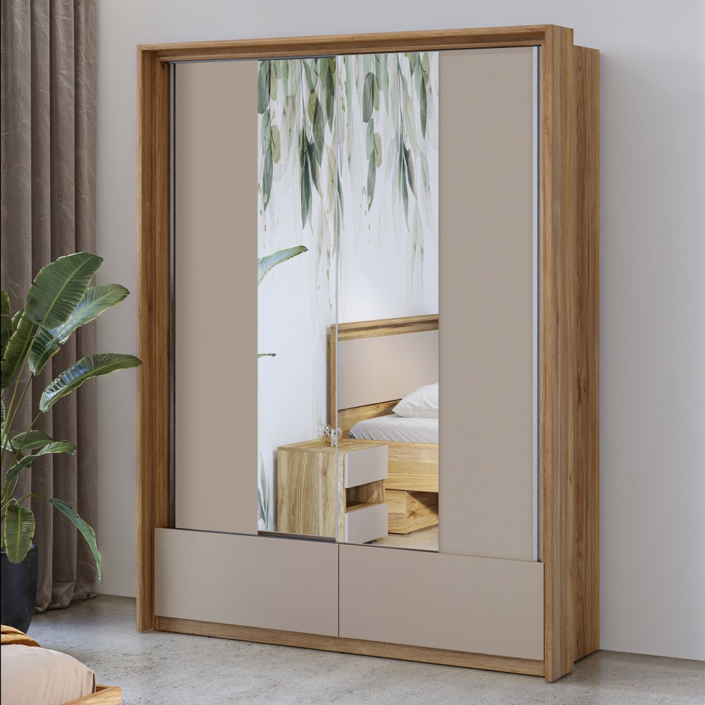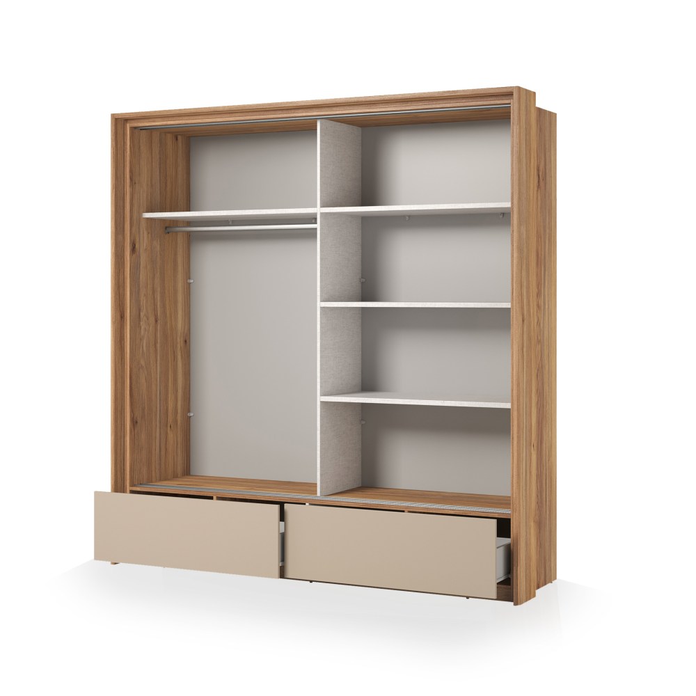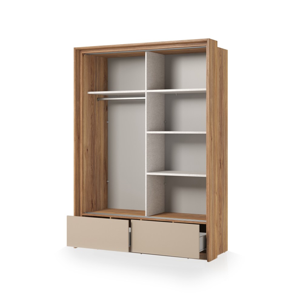 Tampo: Painel de madeira de 15 mm; Base: Painel de madeira de 15 mm; Corpo: Painel de madeira de 15 mm; Corrediças guias de esferas; Pés de plástico
