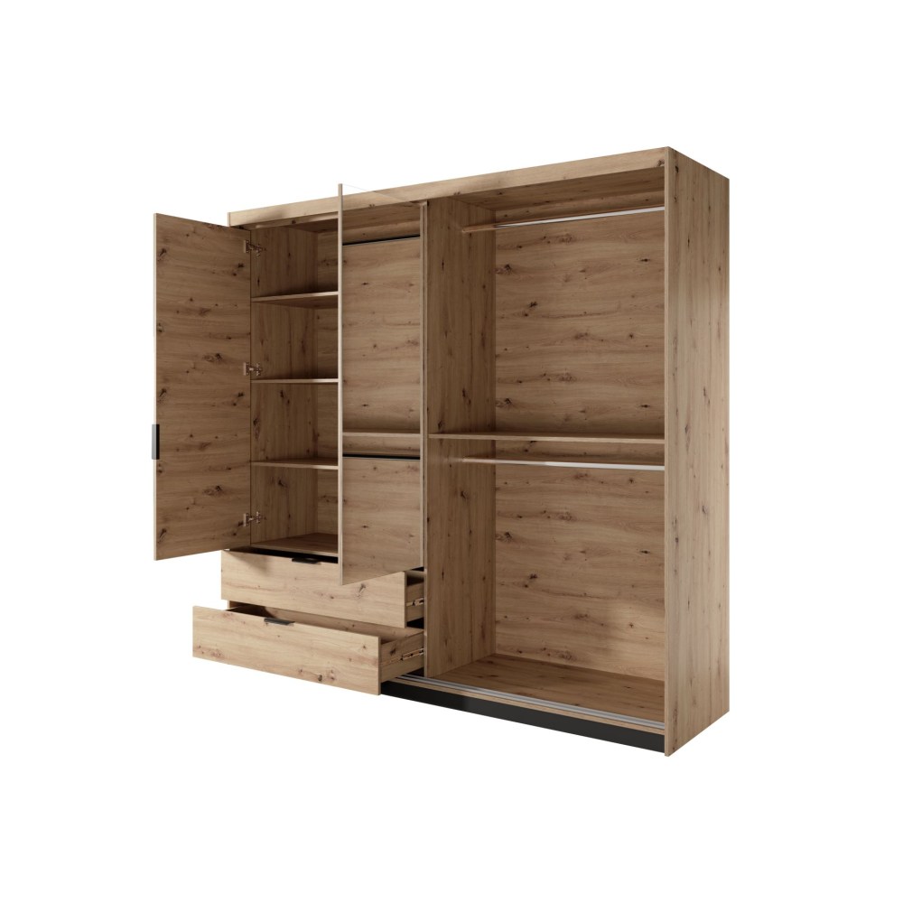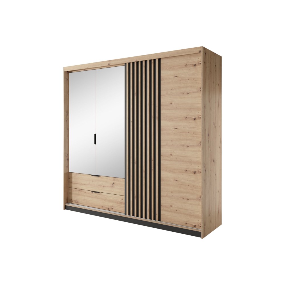 O conjunto TALLY apresenta uma combinação perfeita de tons terrosos suaves — carvalho artesanal e antracite — que confere a qualquer quarto uma sensação aconchegante e natural. As ripas utilizadas nas frentes do guarda-roupa e da cômoda, bem como na cabeceira da cama, adicionam um toque moderno e enfatizam o caráter das peças. Esta coleção é excepcionalmente funcional. Um guarda-roupa espaçoso com um grande espelho, iluminação e gavetas complementa a cômoda espaçosa e a cama confortável, realçada por uma cabeceira estofada e mesas de cabeceira práticas.